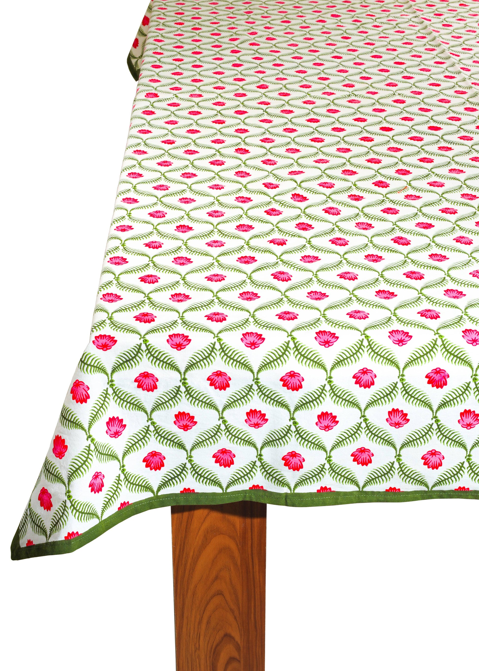 A symphony of elegance and heritage, the Lotus Garden block print tablecloth is a statement of artisanal mastery. Inspired by the serene beauty of lotus blooms drifting across tranquil waters, this exquisite textile is handcrafted using the time-honored block printing technique. Vibrant pink lotuses unfurl gracefully within a delicate lattice of verdant foliage, creating a mesmerizing interplay of color and symmetry. Each motif is meticulously stamped by skilled artisans, infusing this tablecloth with an heirloom-worthy charm.