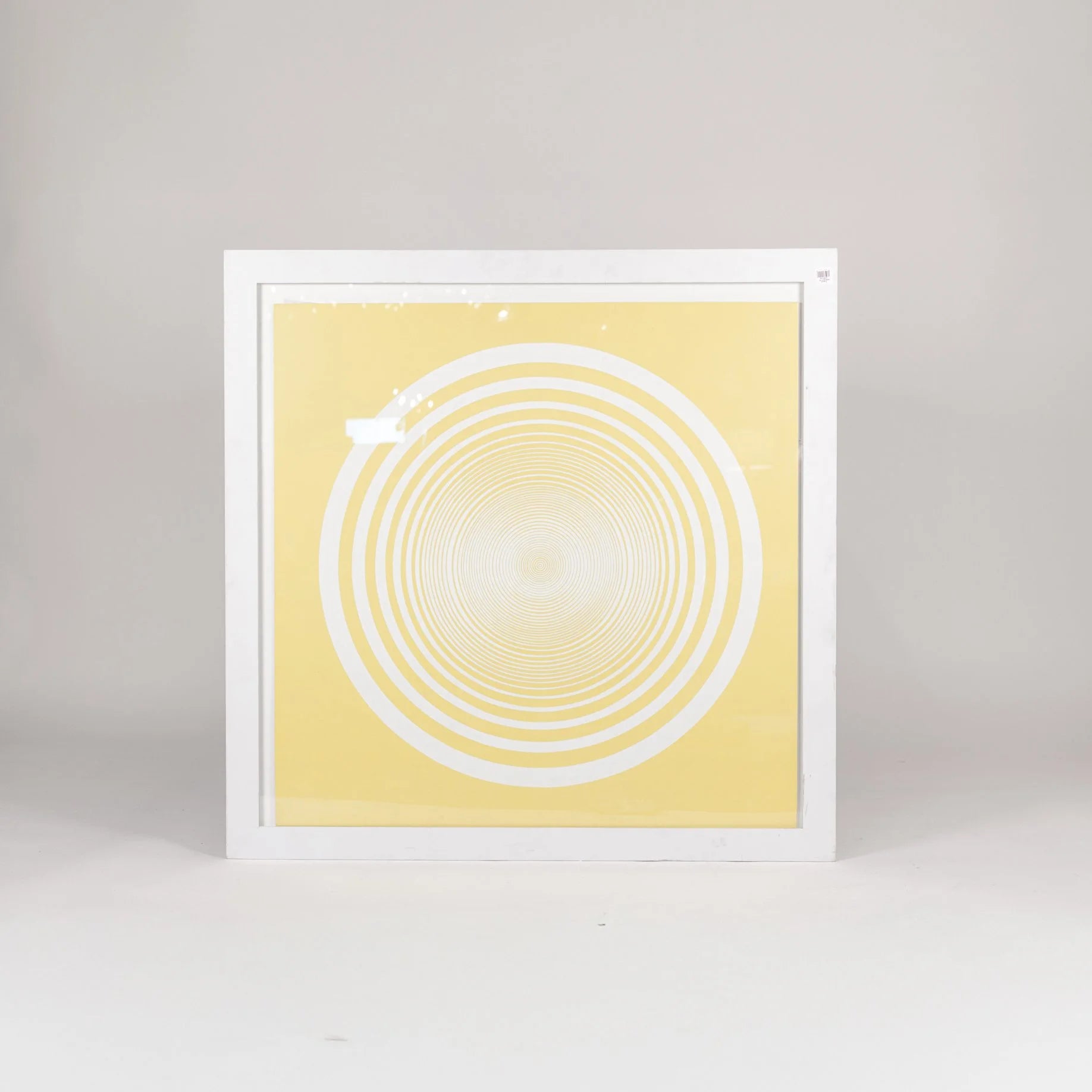 This eye catching piece is visually striking dominated by a series of concentric circles in a yellow and white color, creating an optical illusion effect.